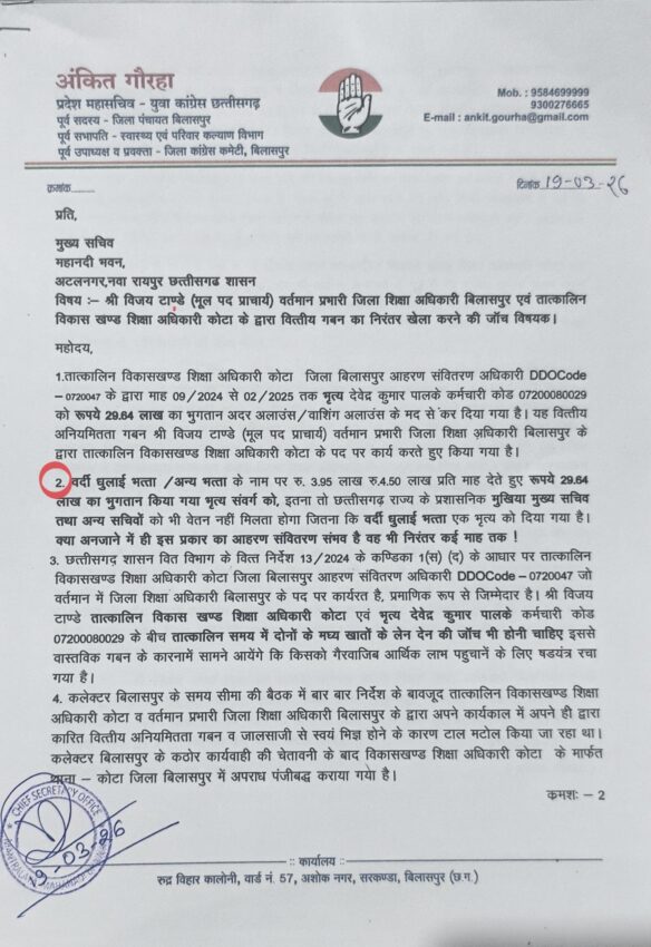 हालांकि इस कार्रवाई के बाद भी कई महत्वपूर्ण सवाल खड़े हो रहे हैं। शिकायत में तत्कालीन विकासखंड शिक्षा अधिकारी कोटा एवं वर्तमान जिला शिक्षा अधिकारी बिलासपुर विजय टांडे की भूमिका को लेकर भी गंभीर आरोप लगाए गए थे। आरोप है कि वित्तीय अनियमितताओं का यह पूरा खेल उनके कार्यकाल में हुआ, इसके बावजूद अब तक उनके खिलाफ कोई ठोस कार्रवाई सामने नहीं आई है। उल्टा, उन्हें पदोन्नति दिए जाने की जानकारी सामने आने से पूरे मामले की निष्पक्षता पर सवाल उठने लगे हैं।