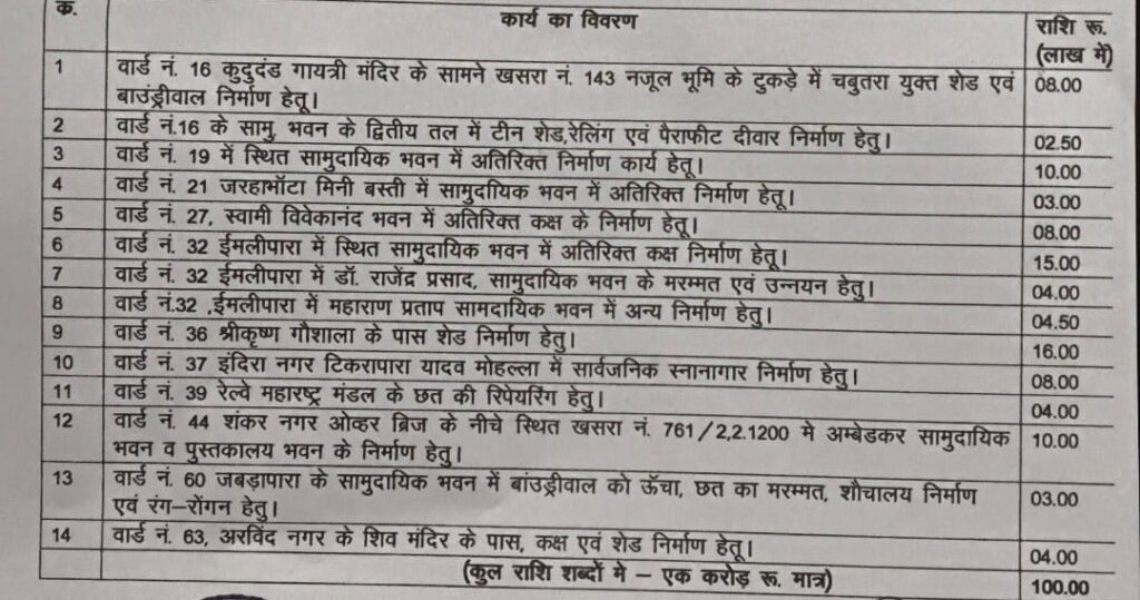 इस राशि से जनसुविधा से जुड़े कार्य किए जाएंगे। इस अवसर पर नगर विधायक अमर अग्रवाल ने कहा कि शहर के प्रत्येक वार्ड का समग्र विकास हमारा लक्ष्य है। विकास कार्य केवल निर्माण नहीं, बल्कि यह जनता के जीवन में सुविधा और संतोष लाने का माध्यम है।