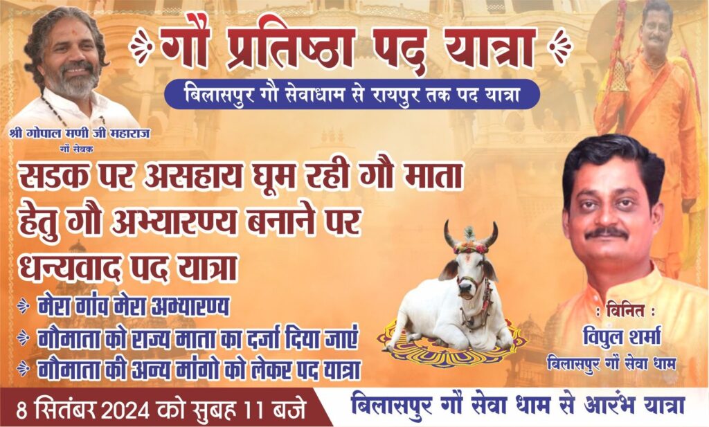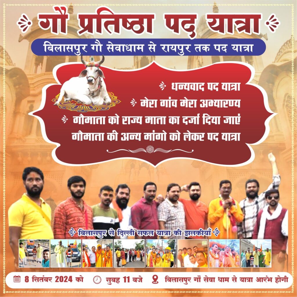 पद यात्रा आरंभ 8 सितंबर को दोपहर 12 बजे बिलासपुर गौ सेवा धाम से रायपुर, भारत माता चौक पर उद्बोधन, यात्रा आगे की ओर प्रस्थान।