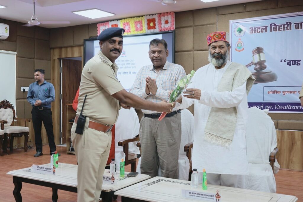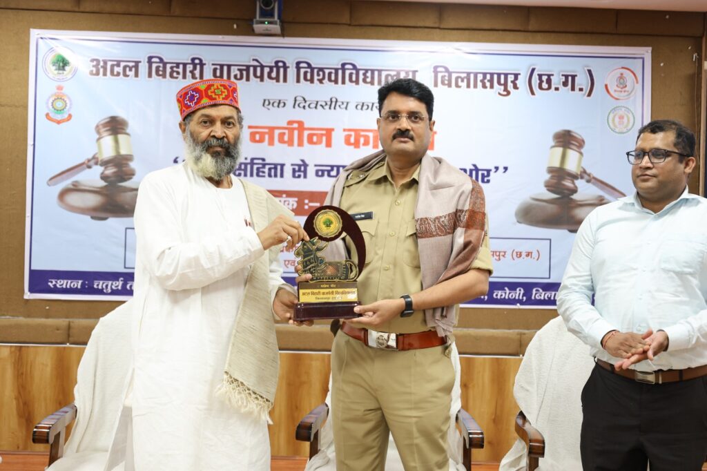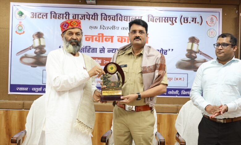 प्रचंड प्रहार न्यूज/बिलासपुर। अटल बिहारी वाजपेई विश्वविद्यालय बिलासपुर के आंतरिक गुणवत्ता प्रकोष्ठ एवं जिला पुलिस बिलासपुर के संयुक्त तत्वाधान में नवीन कानून दंड संहिता से न्याय संहिता की ओर एक दिवसीय कार्यशाला का आयोजन किया गया। कार्यक्रम के मुख्य अतिथि बिलासपुर जिले के पुलिस अधीक्षक रजनेश सिंह थे एवं कार्यक्रम की अध्यक्षता कुलपति आचार्य ए.डी.एन वाजपेई ने किया कार्यक्रम के प्रारंभ में अपने अध्यक्षीय की उदबोधन में कुलपति ने कहा भारत में वर्षों में सुदृढ़ता प्राप्त की है और प्रत्येक क्षेत्र में आगे बढ़ा है और आज चंद्रमा पर चंद्रयान भेजने की उपलब्धि हासिल किया है।