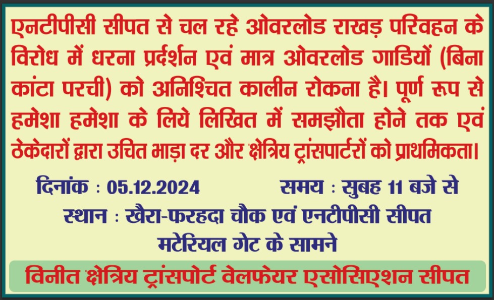 दिनांक 5 दिसंबर 2024 से सीपत एनटीपीसी से राखड़ लेकर निकलने वाले वाहनों को अगर बिना तौल किये सड़को पर उतारा जाता है, तो उसे अनिश्चित समय तक रोका जाएगा। क्षेत्रीय ट्रांसपोर्ट संघ के द्वारा इसके अतिरिक्त एनटीपीसी से उचित दर पर वाहन परिचालन की मांग की गई है। इन मांगों को जब तक पूरा नही किया जाता तब तक, एनटीपीसी से निकलने वाले वाहनों के पहिया थमना तय नजर आ रहा है। एनटीपीसी फरहदा चौक के पास क्षेत्रीय ट्रांसपोर्टर वेलफेयर एसोसिएशन सीपत संघ के पदाधिकारी एवं सदस्य अनिश्चित समय तक उग्र प्रदर्शन करेंगे।