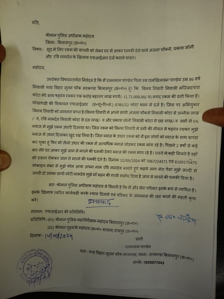 दिनांक 12/09/2024 को 7067224371 एवं 8109275475 मोबाइल नंबर से रतनलाल पाण्डेय के पास फोन आया जो अपना नाम रवि नामदेव बताते हुए कहने लगा मेरा पैसा मुझे जल्दी से जल्दी दो उसका साथी मोंटी नामदेव माँ बहन की गाली गलौच देने लगा जान से मारने की धमकी दिया है। अंत मे थक हारकर पीड़ित रतनलाल पाण्डेय एसपी कार्यालय पहुचे, जहाँ उन्होंने लिखित शिकायत सौपकर कार्यवाही की मांग की है।