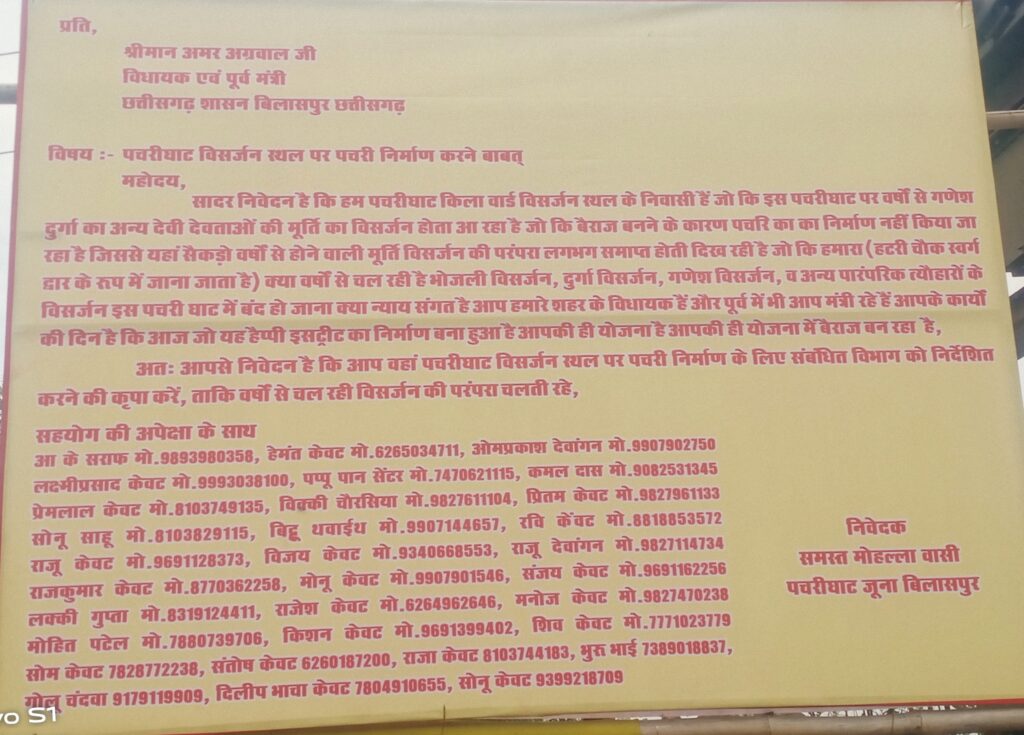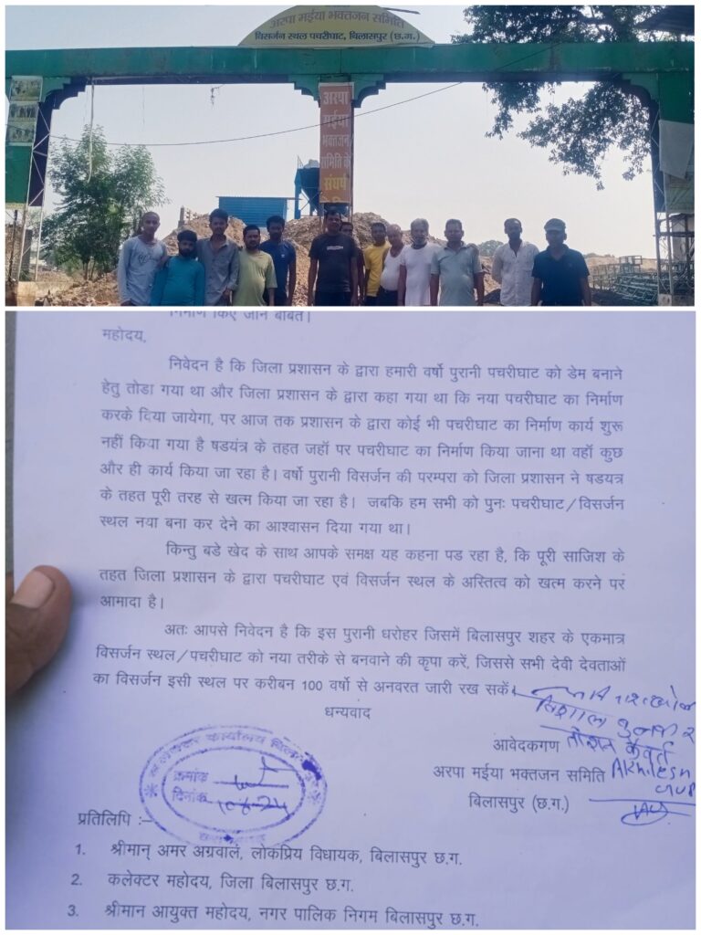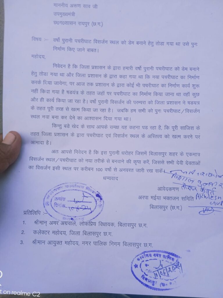 प्रचंड प्रहार न्यूज/बिलासपुर। बिलासपुर शहर के वर्षो पुराने एकमात्र विसर्जन स्थल/पचरीघाट को पुनः व्यवस्थित बनाने अरपा मईया भक्तजन समिति ने उपमुख्यमंत्री अरुण साव व नगर विधायक अमर अग्रवाल सहित जिलाधीश बिलासपुर एवं नगर निगम आयुक्त को ज्ञापन सौंपकर गुहार लगाया है।