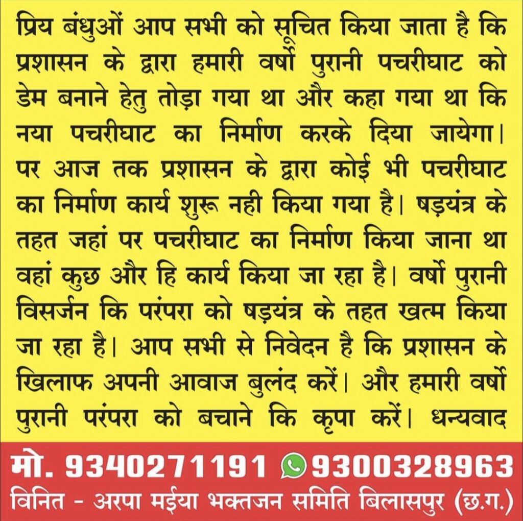विदित हो कि करीब 100 वर्षो से सभी प्रकार के विसर्जन कार्य के लिए स्थानीय लोगो के द्वारा इस पचरीघाट का उपयोग किया जाता रहा है । बैराज निर्माण के लिए पचरीघाट स्थित विसर्जन स्थल को तोड़ दिया गया था। बैराज निर्माण के समय प्रशासन ने आश्वासन दिया था कि यहां नए तरीके से पचरीघाट विसर्जन स्थल का निर्माण कराया जाएगा। लेकिन अब यहां विसर्जन स्थल (पचरीघाट) का निर्माण नही किया जाना आस्था के साथ खिलवाड़ किया जाना प्रतीत हो रहा है। इस प्रशासनिक निर्णय से स्थानीय लोगो में काफी रोष नजर आ रहा है। इस विसर्जन स्थल के पुनः निर्माण की मांग प्रशासन व उपमुख्यमंत्री अरुण साव और शहर विधायक अमर अग्रवाल से की गई है। इसे लेकर अरपा मईया भक्तजन समिति ने कलेक्टर और निगम कमिश्नर को भी ज्ञापन सौंपा है साथ ही सभी दुर्गोत्सव, गणेशोत्सव समितियों तथा स्थानीय लोगो से अपील भी की गई है कि वर्षो पुराने चले आ रहे इस परम्परा, धरोहर को संजोकर रखने में अपना सहयोग प्रदान करे। चूंकि यह समस्या बड़ी है। जिसके निराकरण के लिए त्वरित प्रशासनिक कार्यवाही की आवश्यकता है।